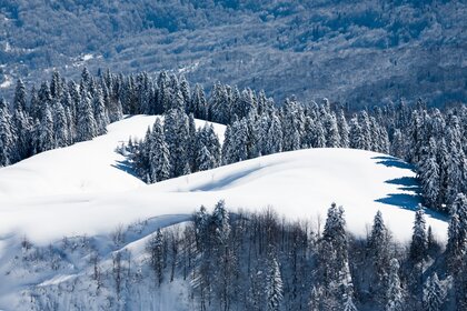 Panorama della foresta innevata sulla collina